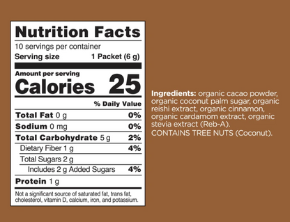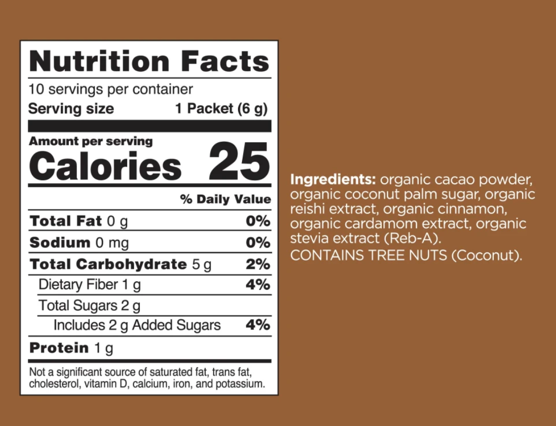 Ingredients: Organic Log-Grown Reishi, Real Organic Cacao, Organic Coconut Palm Sugar, Organic Cinnamon, Organic Cardamom Extract, Organic Stevia Extract