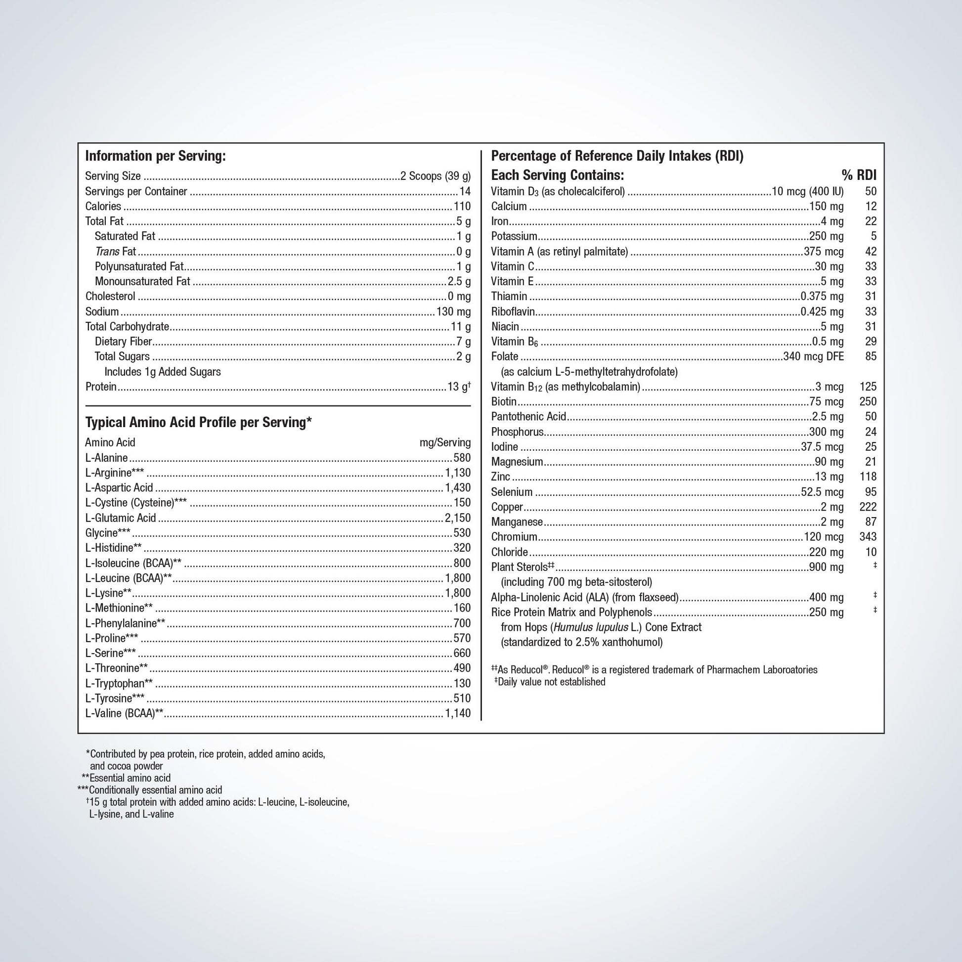- Pea/rice protein with essential amino acids