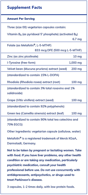 - Includes the cofactors vitamin B6, Metafolin® L-5-MTHF, and zinc to support dopamine production‡