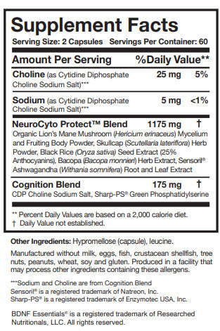 Features & Benefits* BDNF Essentials® is a comprehensive supplement designed to support neurological health. This unique formula is based on ingredients that have been shown to aid in the formation of nerve growth factors such as BDNF, which helps to support neuron health while promoting neuroplasticity, and neurogenesis.