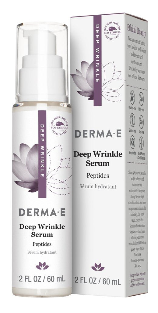 After thoroughly cleansing and toning your skin, pump a small amount of serum onto the fingertips and apply generously to deep lines around your mouth, eyes, and forehead. May be used alone or in combination with other derma e® moisturizers to enhance their effect. Use twice daily.