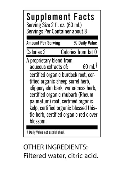 Ingredients: Purified water, aqueous extracts of: certified organic burdock root, certified organic sheep sorrel herb, slippery elm bark, watercress herb, turkish rhubarb root, kelp, certified organic blessed thistle herb, certified organic red clover blossom.