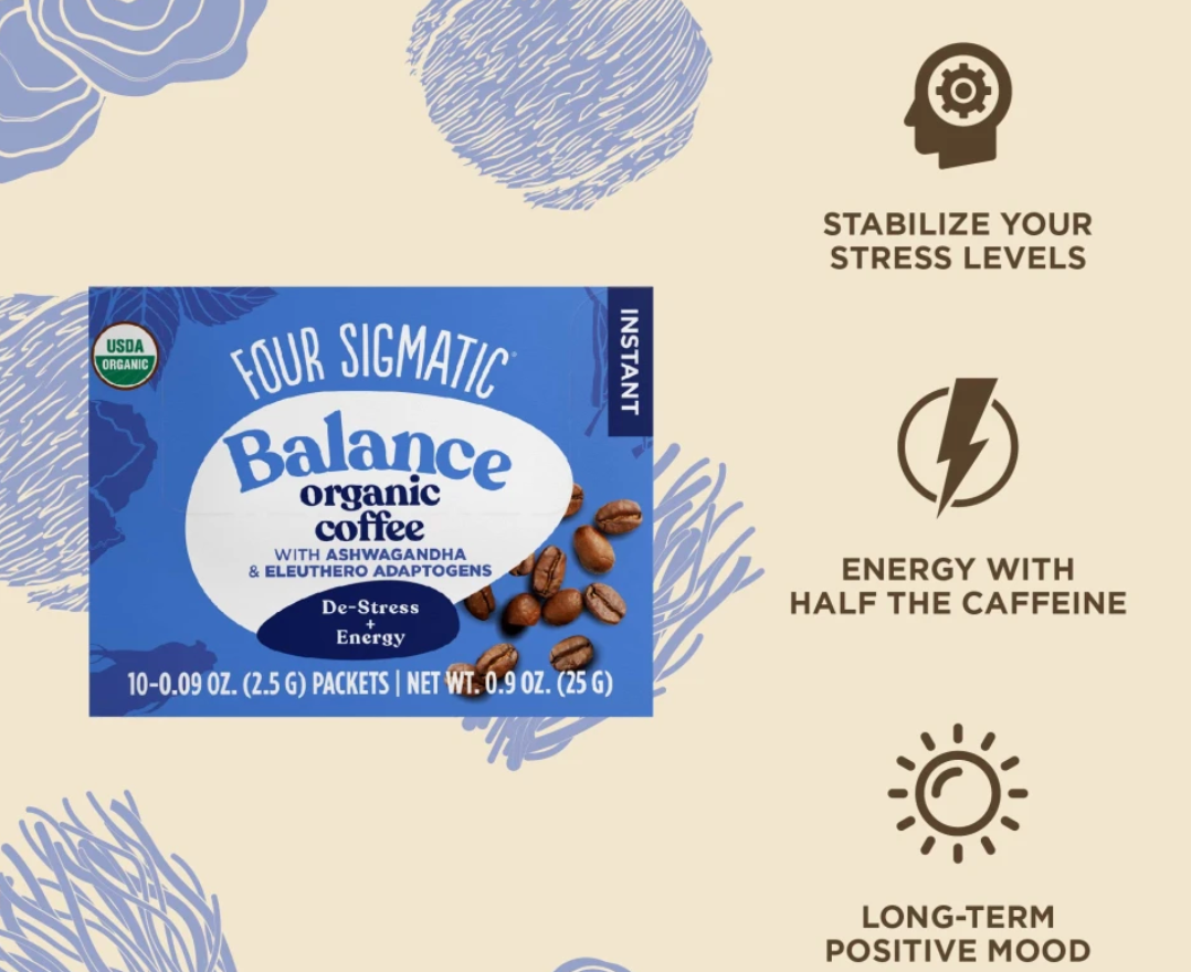 Organic medium roast instant coffee infused with adaptogens including ashwagandha and eleuthero to help you find calm.