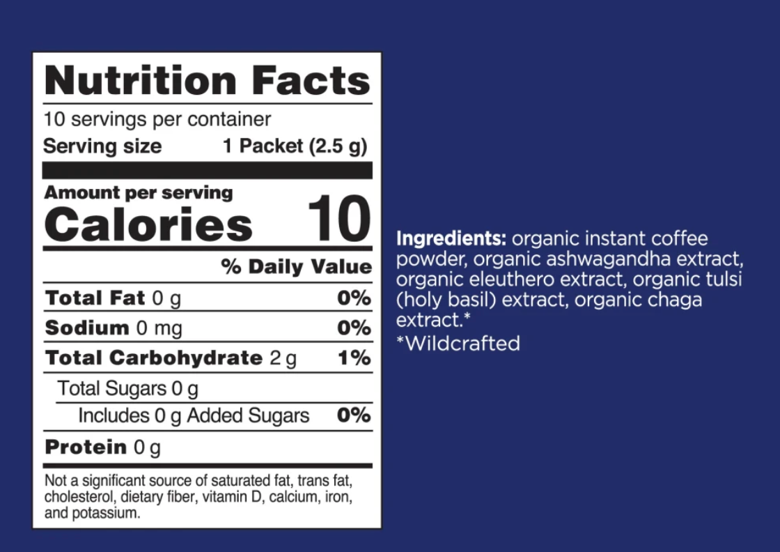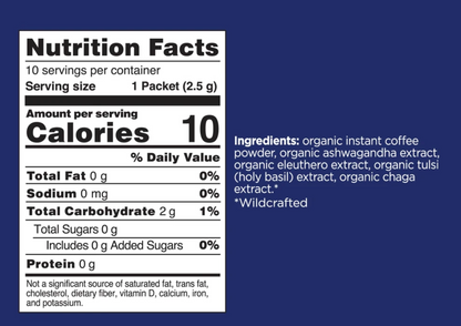 Ingredients: Organic Medium Roast Instant Coffee, Organic Ashwagandha, Organic Eleuthero , Organic Tulsi , Organic Wildcrafted Chaga