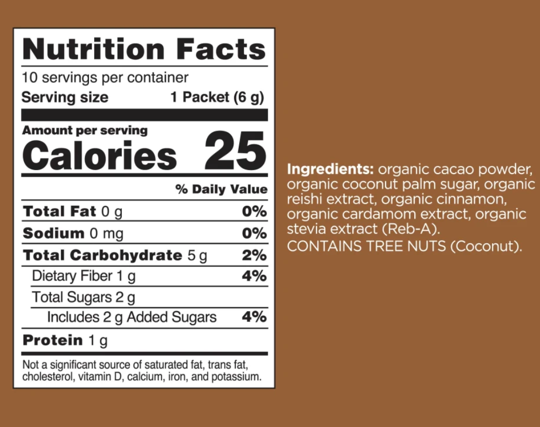 Ingredients: Organic Log-Grown Reishi, Real Organic Cacao, Organic Coconut Palm Sugar, Organic Cinnamon, Organic Cardamom Extract, Organic Stevia Extract