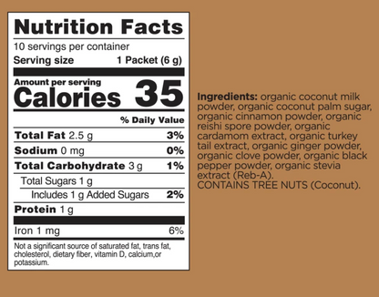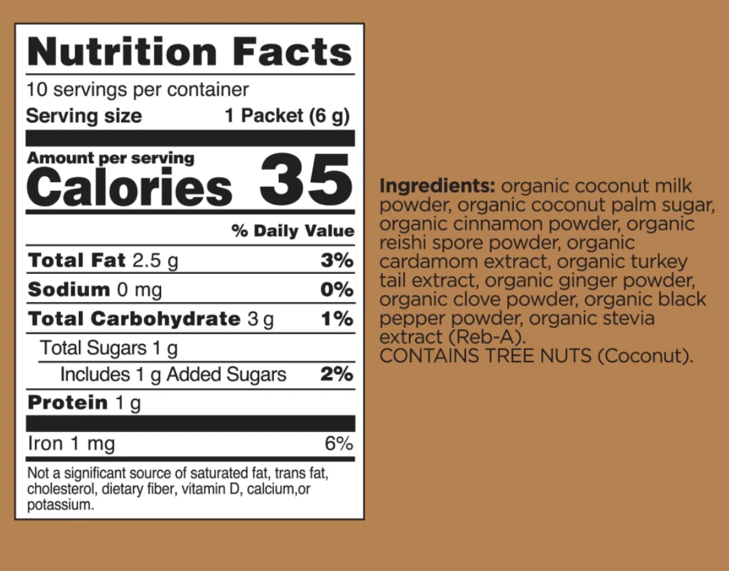 Ingredients: Organic Coconut Milk Powder, Organic Log-Grown Reishi Spore Powders, Organic Log-Grown Turkey Tail, Organic Cinnamon, Organic Cardamom, Organic Ginger, Organic Clove Powder, Organic Black Pepper Powder , Organic Coconut Palm Sugar And Organic Stevia