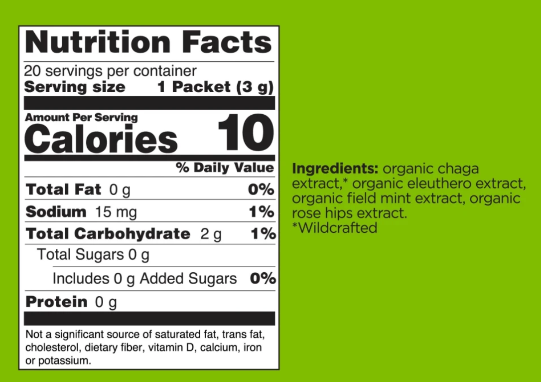 Ingredients:Organic Wildcrafted Chaga (1500 Mg), Organic Eleuthero, Organic Field Mint, Organic Rose Hip