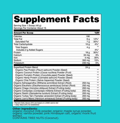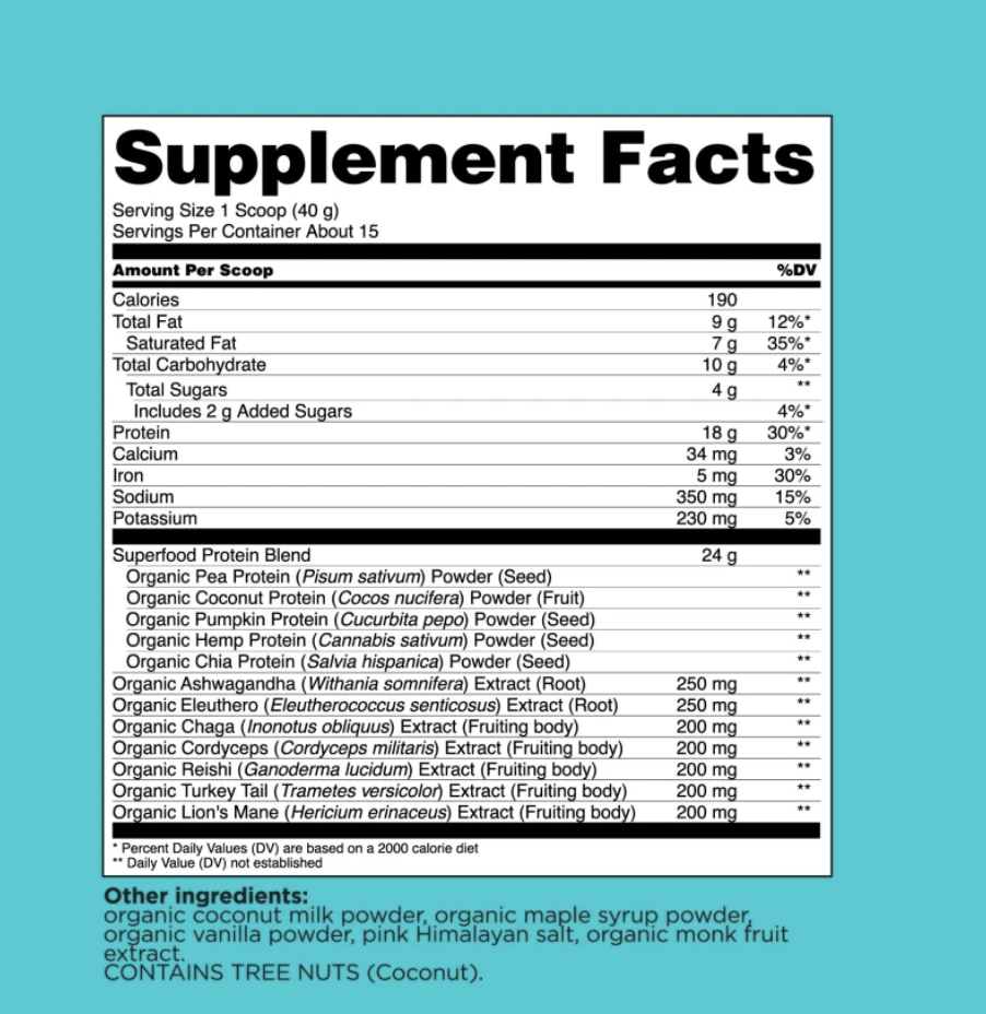 Ingredients: Organic Plant-Based Protein, Organic Lion’s Mane Mushroom, Organic Reishi Mushroom, Organic Cordyceps Mushroom, Organic Chaga Mushroom, Organic Turkey Tail Mushroom, Organic Ashwagandha, Organic Eleuthero, Real Organic Vanilla