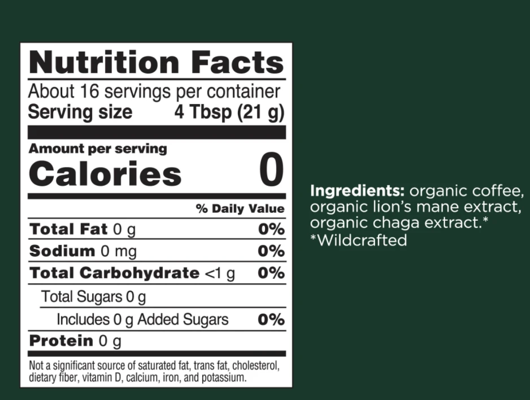 Ingredeints: Organic Dark Roast Arabica Coffee, Organic Log-Grown Lion’s Mane, Organic Wildcrafted Chaga