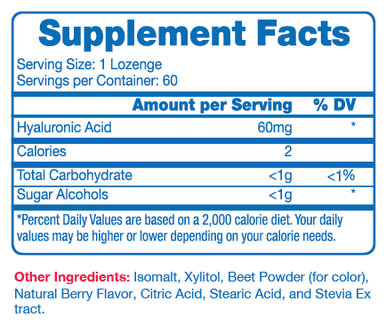 Hyaluronic Acid, Isomalt, xylitol, beet powder, natural berry flavor, citric acid, stearic acid, and stevia extract.
