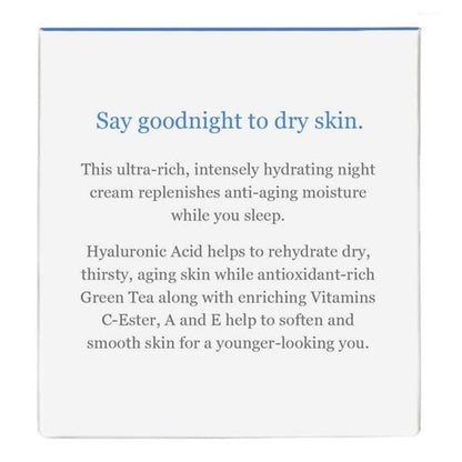 Thoroughly moisturize and plump skin to reduce the look of fine lines and wrinkles with this ultra-hydrating night crème. This extra-rich, deeply penetrating formula delivers the unmatched hydrating properties of nature's moisture magnet, Hyaluronic Acid (HA). A single molecule of HA can hold up to 1,000 times its weight in water, binding moisture to help plump, soften, smooth, tone and rehydrate skin. Enriched with anti-aging antioxidants Green Tea, Vitamins C and E, and soothing Aloe, this formula helps defend skin from free radicals and the effects of the environment. Ideal for dry, dehydrated skin that needs richer moisture throughout the night, this crème delivers maximum hydration while helping diminish the signs of aging for softer, smoother, younger-looking skin. 100% vegan, cruelty-free, paraben-free, sulfate-free, mineral oil-free, lanolin-free, gluten free, GMO-free.