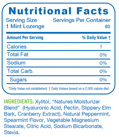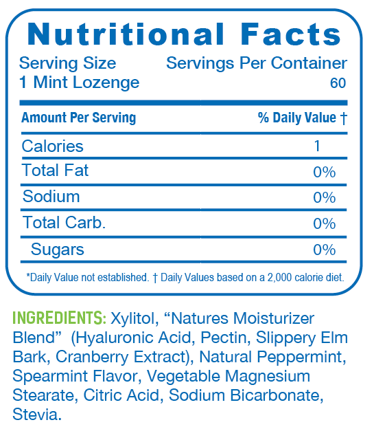 Xylitol, "Natures Moisturizer Blend" (Hyaluronic Acid, Pectin, Slippery Elm Bark, Cranberry Extract), Natural Peppermint, Spearmint Flavor, Vegetable Magnesium Stearate, Citric Acid, Sodium Bicarbonate, Stevia.