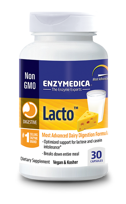 Lacto™ contains lactase and eight other enzymes that work synergistically to digest dairy sugars, proteins and fats. Complete dairy digestion may naturally reduce discomforts which are common to lactose and casein intolerance.*