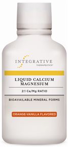 Liquid Calcium Magnesium provides a 2:1 ratio of calcium (citrate) to magnesium with an orange-vanilla flavor.