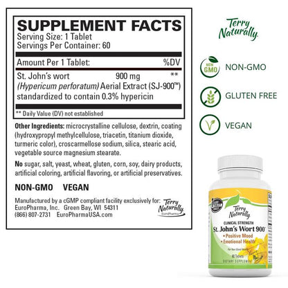 St. John’s wort has a proven record of effective clinical trials and decades of use. The standardized extract in St. John's Wort 900 features the recommended level of 0.3% hypericin—the herb's key compound—that shows remarkable benefits for positive mood and emotional health.*