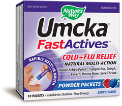 Umcka Cold+Flu Berry FastActives combine Pelargonium sidoides (EPs 7630) 1X and Alpha CF into one great-tasting, non-drowsy, multi-action cold and flu formula. The convenient delivery form allows you to pour great-tasting powder directly into your mouth. The powder packets are easy to pack and carry with you, so you can take them at a moment’s notice. Plus, they’re delicious and safe for ages 6 and up.