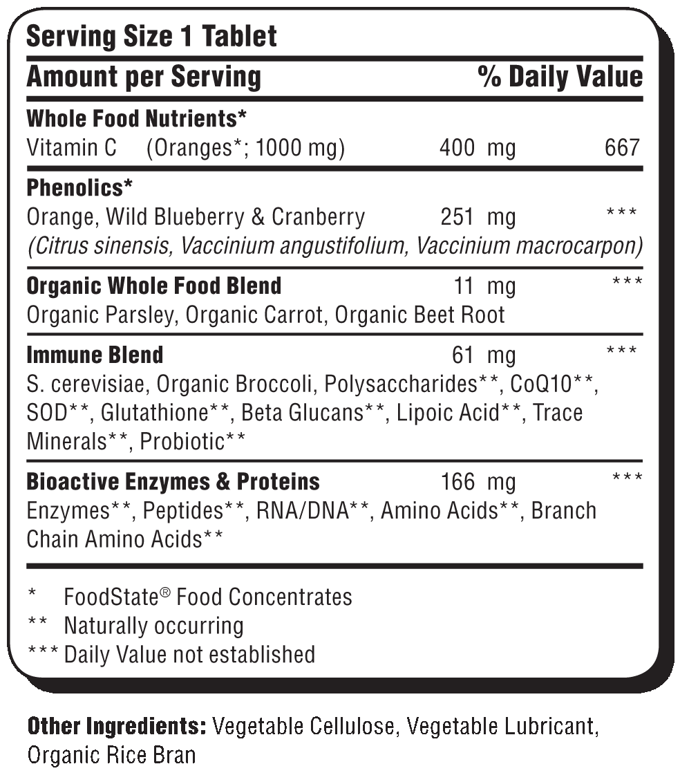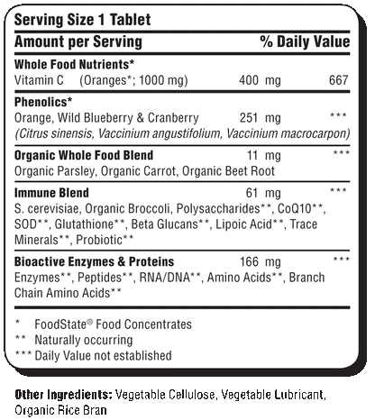 Vitamin C-400 contains a high potency of 100% whole food vitamin C from True Active™ FoodState. Whole food vitamin C does not exist as ascorbic acid alone, but rather co-exists within a synergistic network that inherently contains an array of immune supportive compounds, enzymes and other co-factors, and delivers a myriad of beneficial bioflavonoid food compounds known to have nutritive activity in the body.