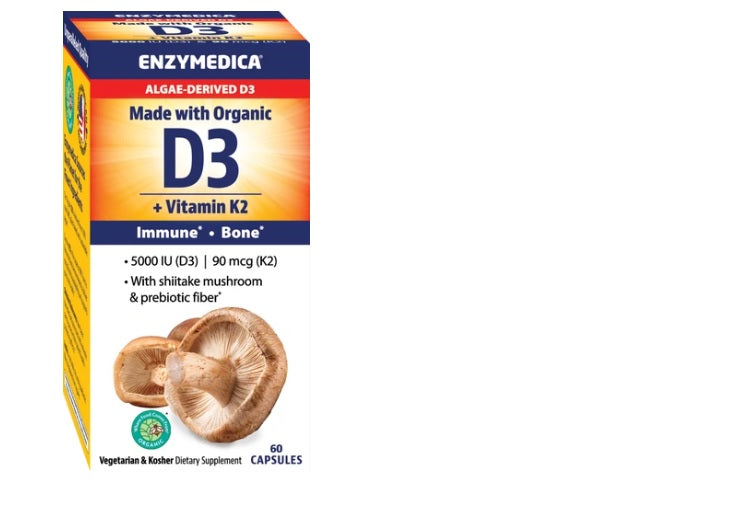 Enzymedica Vegatarian Vitamin D3 + K2 is a whole food formula sourced from USA grown shiitake mushrooms and chickpeas, to help boost a healthy immune system, build strong bones and provide digestive support.
