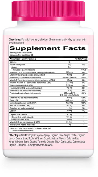 Organic, vegetarian multivitamin with 15+ premium nutrients for women. Non-GMO with Omega-3s.
