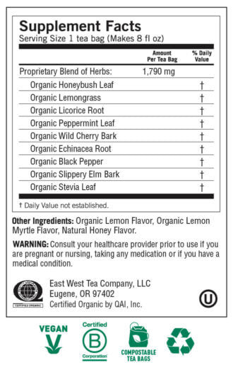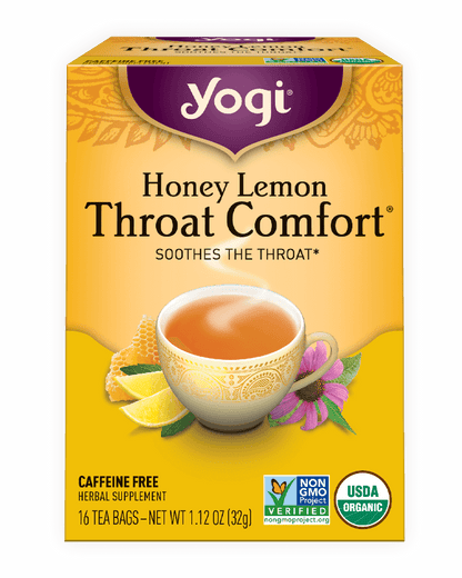 Yogi Honey Lemon Throat Comfort® tea is purposefully blended with Wild Cherry Bark, an ingredient traditionally used by native North Americans for its soothing properties, and Echinacea, which helps to supply antioxidants. With notes of naturally-sweet Honeybush and refreshing Peppermint, Yogi Honey Lemon Throat Comfort® tea is a tasty tea to comfort and soothe your throat.*